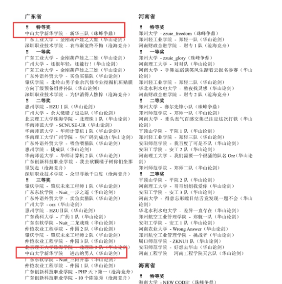 2018年4月20日,2018 年“中国高校计算机大赛-团体程序设计天梯赛“公布获奖名单。我院学子在赵小蕾老师,张海老师的指导下获得了高校省赛特等奖,团队特等奖一队,三等奖一队的好成绩。其中团队特等奖-新华学院队和广东工业大学,深圳职业技术学院同时获得,排名第一。