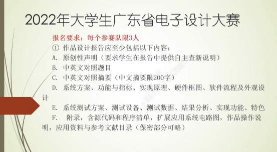 随后,许志明老师向学生指示道,具体硬件设计、软件编程、系统调试和设计报告撰写等部分,为参赛人员所必须上交的,要求学生的自主设计、独立完成。其中还说明道,设计报告题目和摘要都需有中英文对照,正文五千字左右,需进行报告查重。