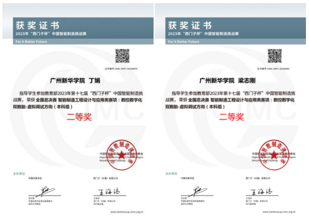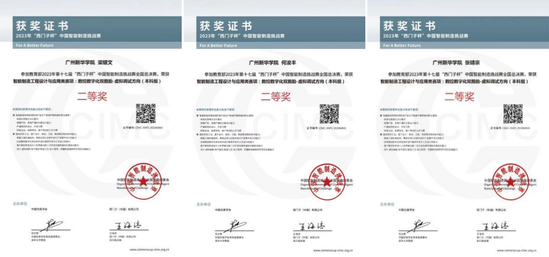 2023年8月15日,第十七届CIMC“西门子杯”中国智能制造挑战赛全国总决赛落下帷幕,我校suncitygroup太阳新城学子不负众望,再创佳绩。由丁娟和梁志刚两位老师带领的队伍荣获“数控数字化双胞胎-虚拟调试赛项”本科组全国总决赛二等奖,创历史最好成绩。该队伍的成员梁键文、何浚丰、张靖宗,均来自2021级智能制造工程专业。此次的收获不仅给学校带来荣誉,更是为学院的荣誉墙增添了光辉的一笔。