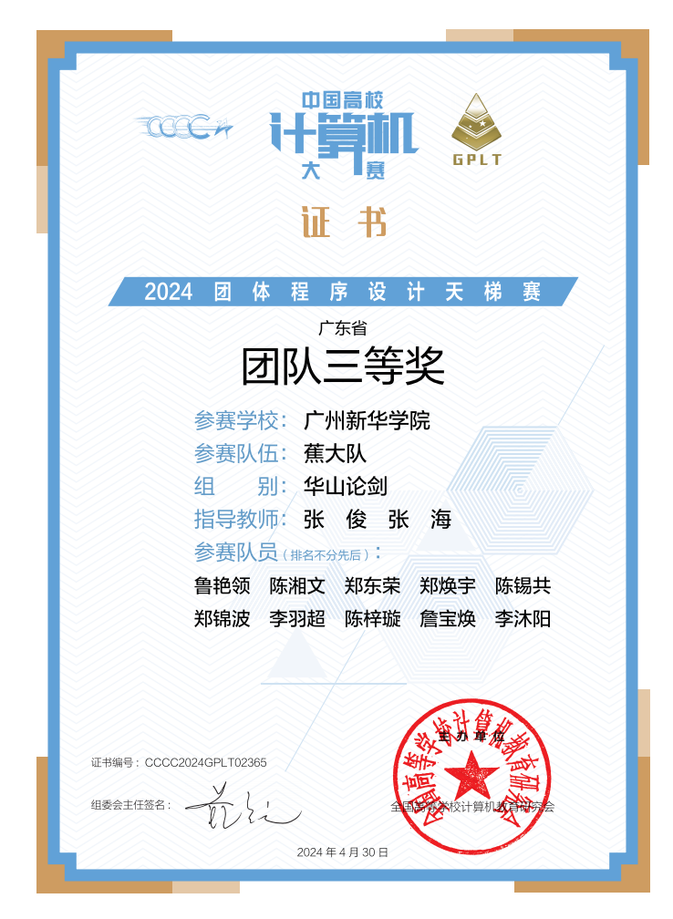 2024年度中国高校计算机大赛-团体程序设计天梯赛于2020年4月20日在全国范围内成功举办。我校suncitygroup太阳新城的学子们在此次大赛中勇创佳绩,充分展示了他们出色的编程技能和团队合作精神。在这场具有全国影响力的高水平计算机竞赛中,我校共派出三支队伍参与,其中两支队伍荣获广东省三等奖。