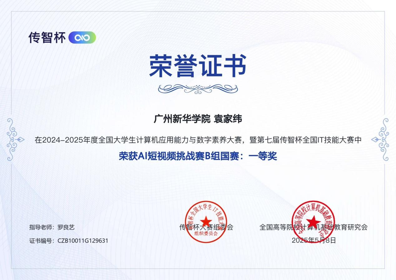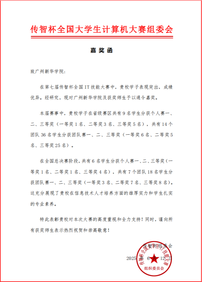 竞赛组委会在嘉奖函中特别指出:广州新华学院学子以扎实的专业素养和创新精神,在大赛中屡创佳绩,充分彰显了学院在信息技术人才培养领域的深厚底蕴。组委会同时对学院的组织工作给予肯定,并勉励获奖师生再接再厉。