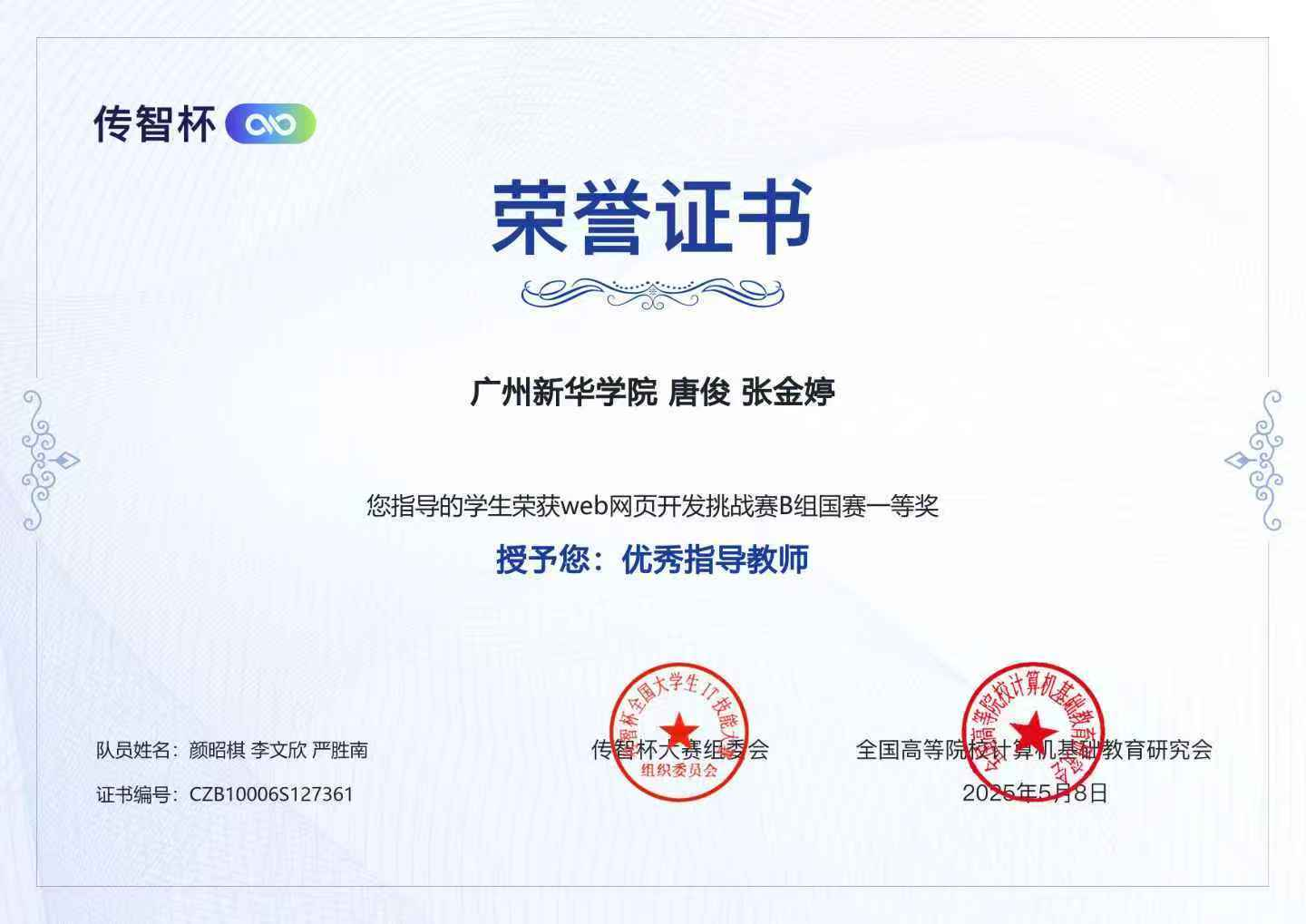唐俊、张金婷、罗良艺、刘维、张树彬、万智萍、张俊、赖刘生、许志明、禤俊峰等多位指导老师在各自国赛指导中表现突出,荣获国赛“优秀指导教师”称号。