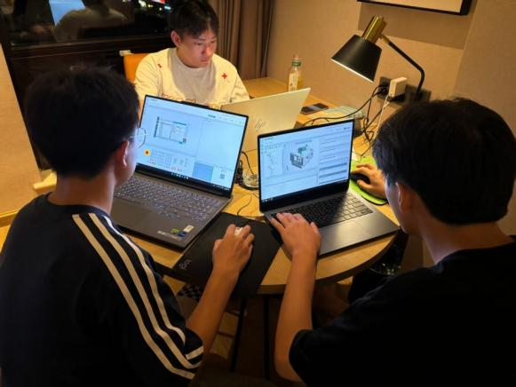 初赛阶段,团队成员和指导老师每天都在实验室里刻苦钻研,不断优化设计方案,提升技术水平,付出了艰辛的努力。决赛阶段,指导老师与学生更是夜以继日,凌晨一点仍在讨论方案、调试设备。总决赛 “智能装备设计数字孪生智造”赛项由刘铭奇、袁志佳、章恩三位同学组成总决赛队伍,分工明确、协同作战。队长刘铭奇统筹训练全局,主攻数控建模与机床仿真加工,为团队筑牢根基。章恩专攻工装设计、图纸绘制与机床搭建,为项目实施提供有力技术支持。袁志佳聚焦PLC设计与界面开发,以代码构建智能控制核心,开发出高效稳定系统,为项目注入智能灵魂,是团队在智能控制领域的坚实支撑。师生同心协力,凭借着顽强的毅力和拼搏的精神,终于获得优异成绩。