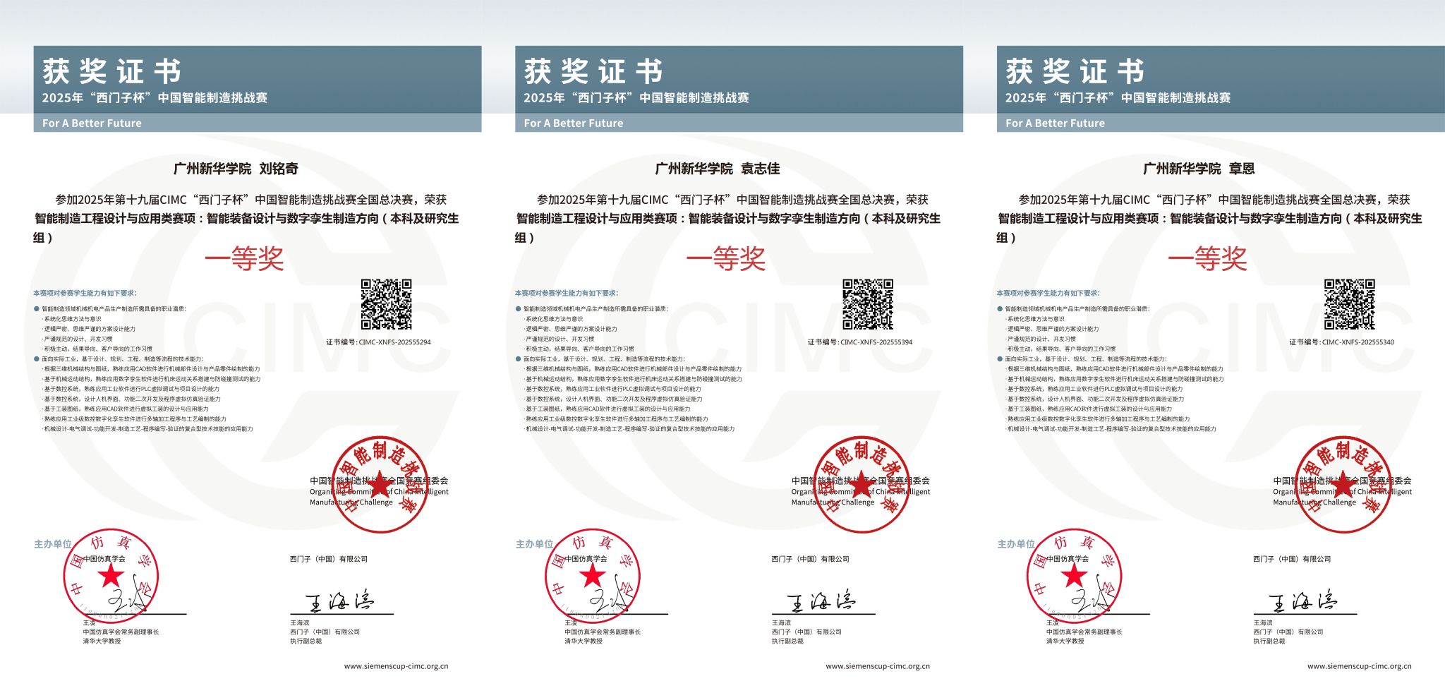 2023级智能制造工程专业刘铭奇、袁志佳、章恩获第十九届“西门子杯”中国智能制造挑战赛全国总决赛一等奖