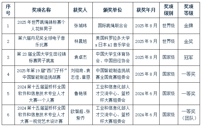 信工院学子在竞赛中展现出过硬的专业能力与创新精神,不仅在工科领域屡创佳绩,更在跨学科赛事中实现突破。2023级智能制造工程专业刘铭奇、袁志佳、章恩分工协作,攻克数控建模、PLC设计等难题,斩获第十九届“西门子杯”中国智能制造挑战赛全国总决赛一等奖,创造了我校在该赛事中的历史最佳成绩;2022级数字媒体技术专业林晨旭凭借其创新作品,问鼎2025年丹尼奖国际电子音乐大赛金奖,该赛事是目前世界国际电子音乐重量级权威赛事,被誉为电子音乐界的“奥斯卡”;2023级软件工程专业袁卓杰勇夺第23届全国大学生田径锦标赛男子跳高冠军,是我校在全国大学生田径锦标赛历史上首枚跳高金牌,也是我校在该项赛事中取得的历史性佳绩;2023级数字媒体技术专业张城玮斩获2025年世界跳绳锦标赛个人花样男子组金牌,这不仅是中国跳绳队在该项目上的世锦赛首金,也成为首位登顶该项目世锦赛冠军的中国运动员。学子们的出彩表现,生动诠释了新工科学生“专业扎实、跨界融合、勇于突破”的综合素养。