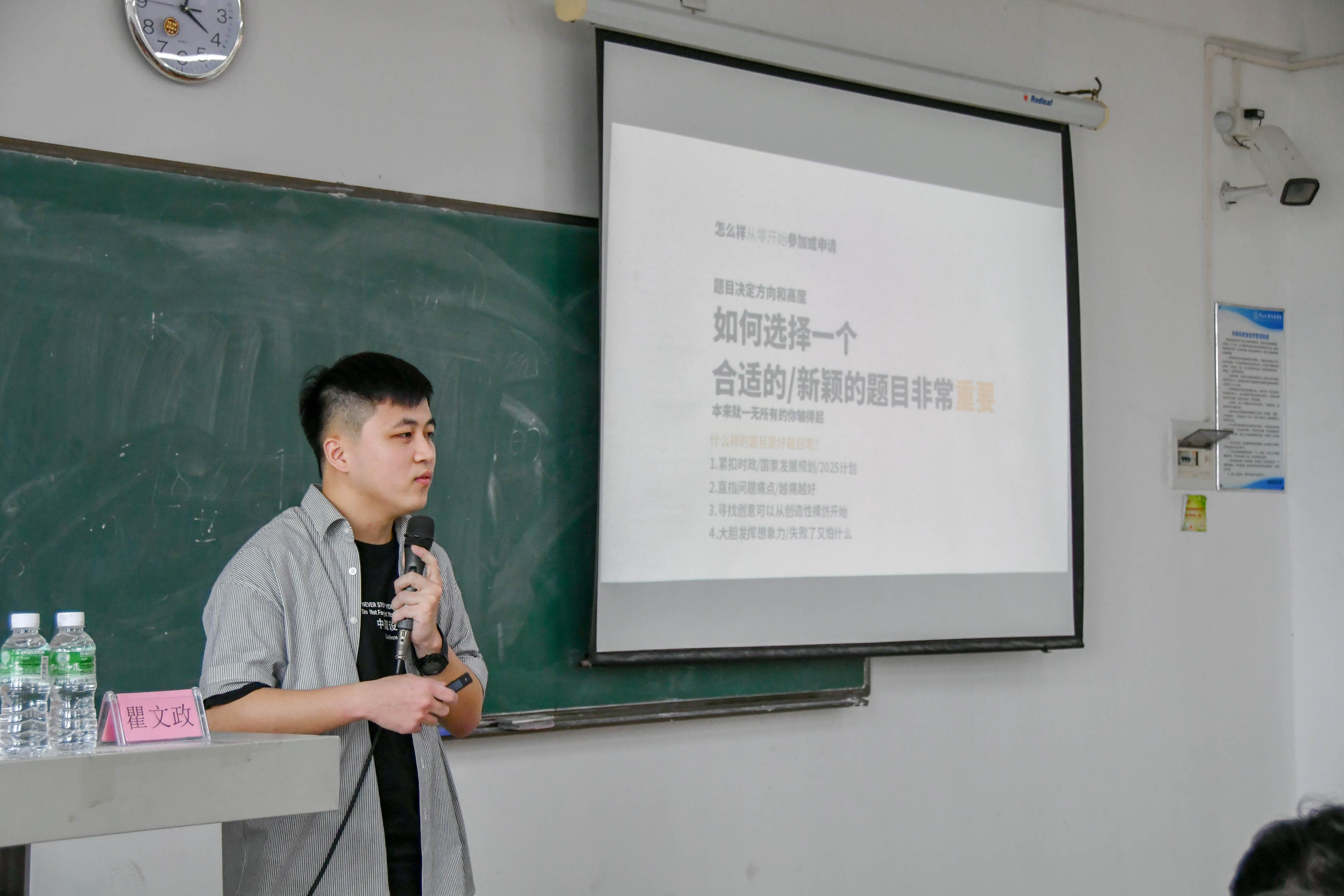 为了让同学们对科研与竞赛中的种种事项了解更加透彻,如何从零开始参加竞赛或申请项目,15级电子信息科学与技术专业的瞿文政师兄给同学们分享了他参加比赛后得出的经验,让同学了解为什么去参加科研和竞赛,如何参加,以及在大学里如何给自己一个评判标准和奋斗目标等。
