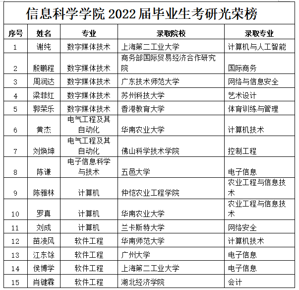 随着2022年考研招录工作接近尾声,广州新华学院2022届毕业生考研捷报频传。我校信息科学学院2022届毕业生共有15名学子考研升学成功,再创佳绩。国内升学13人,包括华南师范大学、华南农业大学、广州大学等重点高校,境外2人,分别为香港教育大学、兰卡斯特大学。