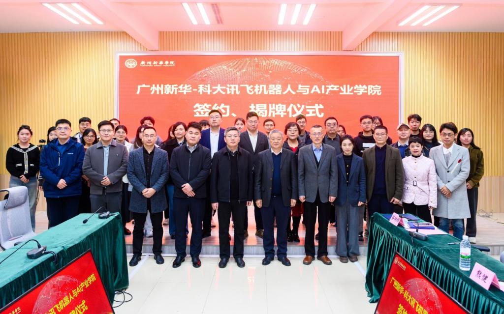 2025年2月26日,广州新华学院(以下简称“我校”)与科大讯飞股份有限公司(以下简称“科大讯飞”)携手合作,共同成立了广州新华-科大讯飞机器人与AI产业学院。当日下午,双方在东莞校区格物楼2A208会议室隆重举行了签约与揭牌仪式。