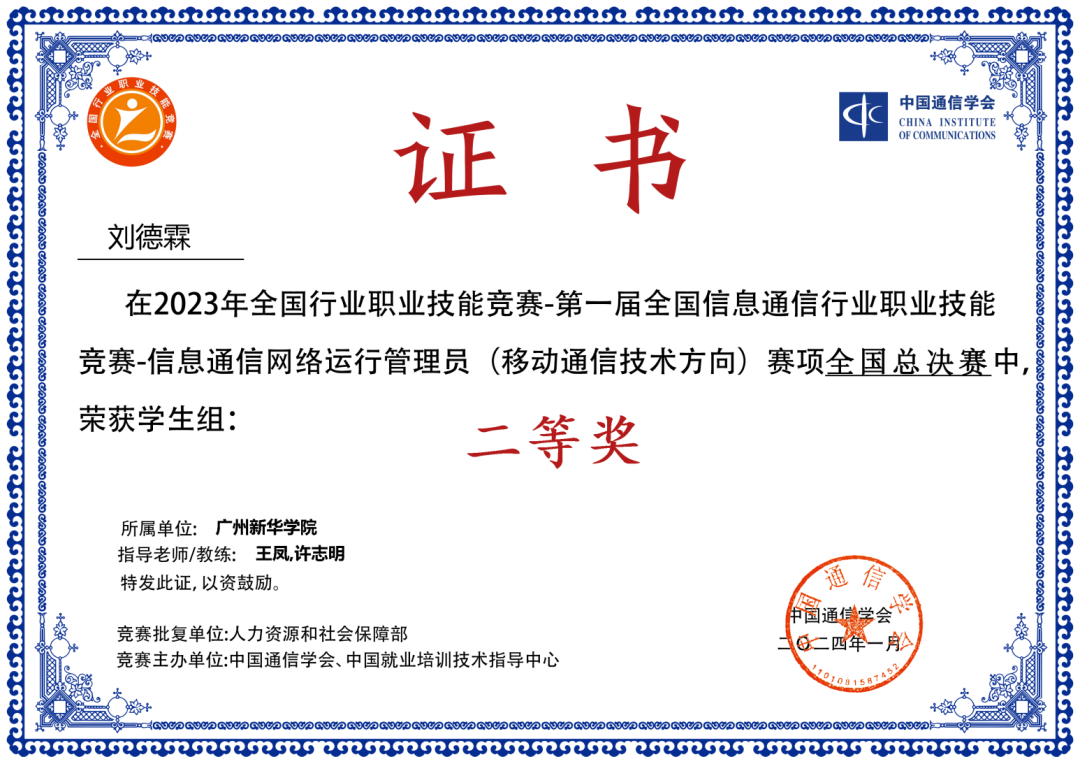第二届全国信息通信行业职业技能竞赛国家级“一等奖”;