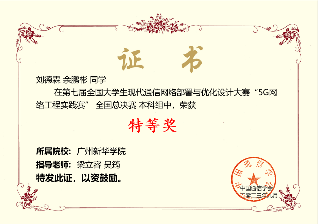 第七届全国大学生现代通信网络部署与优化设计大赛国家级“特等奖”;