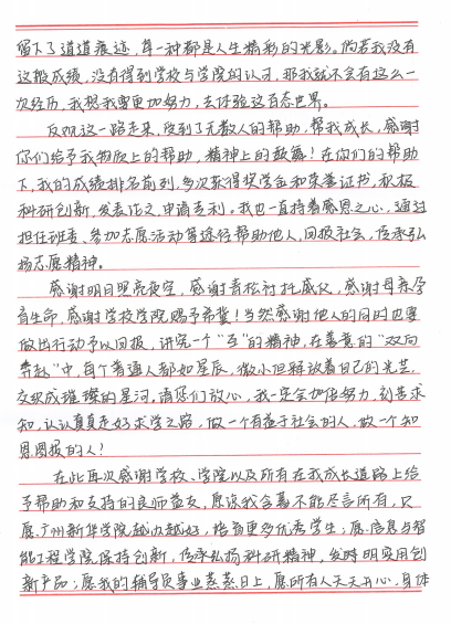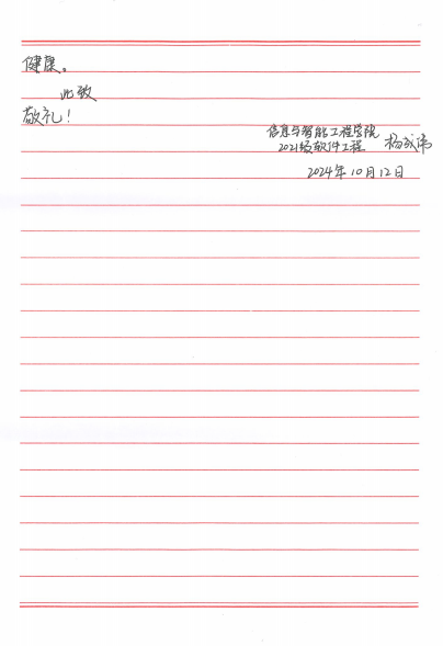 归国后,杨成伟同学心怀感恩,亲笔撰写感谢信。信中真挚地表达了对学校及学院悉心培育、慷慨资助的感激之情,回顾留学路上学院始终是他坚实的后盾,让他能无后顾之忧逐梦远方。这份感恩也化作他前行的动力,誓言要把留学所得回馈学院、惠及同学,带动身边人一同奋进。