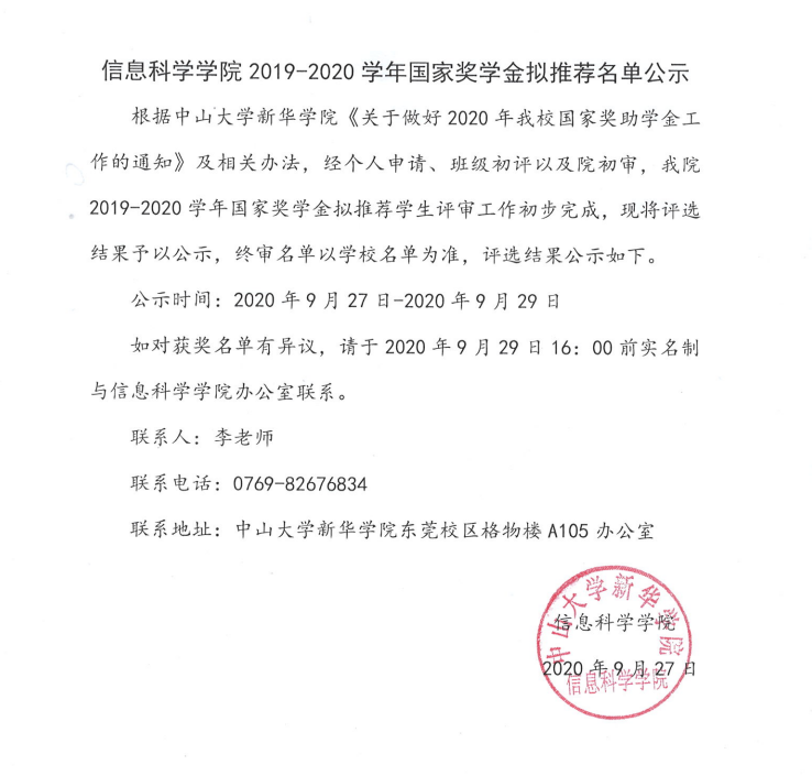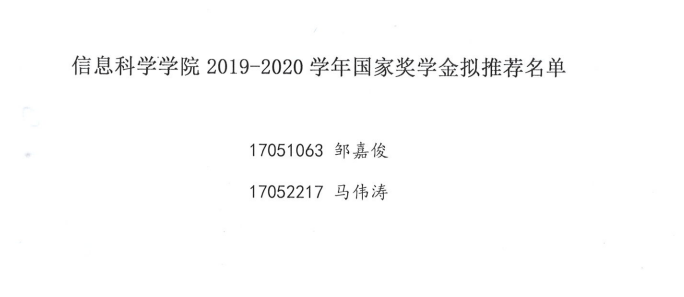 【公示】信息科学学院2019-2020学年国家奖学金拟推荐名单公示
