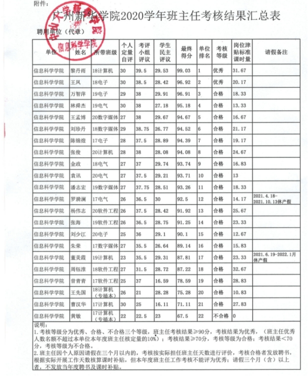 根据《广州新华学院班主任工作实施办法》文件精神和管理规定,通过班主任自评、学生评议、学院考评小组评议三个环节,对我院2020学年全体班主任进行考核,现将考核结果公示如下: