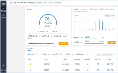 学生提交试卷后,系统将自动批改客观题(单选题、多选题、判断题、填空题),刘华章老师马上对答卷主观题进行手动批改,学生们很快就知道自己的考试成绩了。