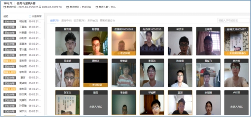 在监考页面中看到所有学生的考试状态,左侧动态按照时间倒序,标明了学生开始答题、考试异常、交卷、考试作废等状态。右侧显示学生列表,图片为其身份检验时拍摄的摄像头图像,考试异常或未检测到摄像头的同学将在列表中被标注出来,点击可进入学生个人页面。