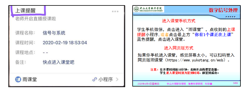 预备上课提示、学生接收到开启弹幕和语音直播通知