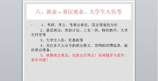 谷长乐老师从学校疫情防控要求、就业推荐表、毕业生登记表、三方协议、就业追踪、就业上报、基层就业、大学生入伍等方面展开就业动员大会。