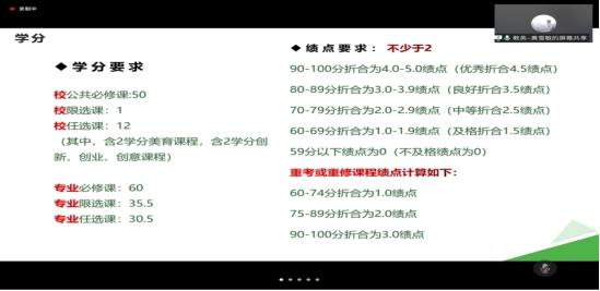 第三位介绍的是学籍管理处的黄雪敏老师,她强调了学业的重要性,为同学们详细说明了绩点评分的规则、选课的注意事项,以及让同学们预防违规事项的发生,发生违规试想的后果等。黄老师希望引起同学的高度重视,也希望所有同学都能够顺利毕业。
