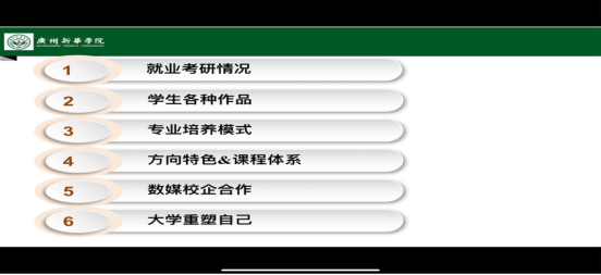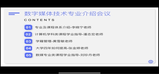 第四位是数媒专业类课程学业指导的刘珍丹老师,她为同学们介绍了数字影视和虚拟现实技术、交互移动端和数据可视化这两个专业方向,让同学们学好思维视野类、设计类、程序类等核心基础课程,刘老师也分享了企业综合实践和师兄师姐们的优秀作品,并鼓励同学们积极参加专业竞赛,最后刘老师展示了优秀实习生,让我们以他们为榜样,向梦想奔跑吧!
