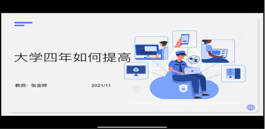 随后,同学们观看了计算机学科类课程学业指导--潘志宏老师提前为同学们精心录制好的视频,介绍了择业的一些方向,分享了很多干货知识,比如明确了解自己的特长选择就业方向,尽可能扩大自己的影响力等。