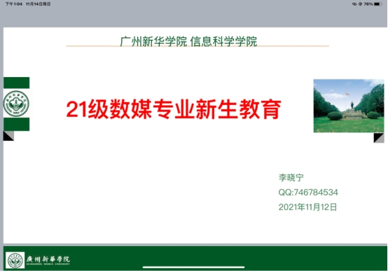 首先是李晓宁老师对同学们进行了数媒专业新生教育,包括就业考研情况、学生各种作品、专业培养模式、方向特色和课程体系、数媒校企合作、大学重塑自己等六大方面的内容。最后,李晓宁老师祝愿同学们大学四年学业有成。
