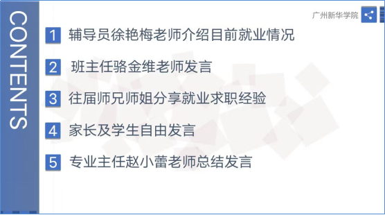 凤凰花待开,学子初涉世;四年磨一剑,是时把剑亮。广州新华学院这片沃土孕育了一代代优秀学子,桃李遍布华夏,为祖国的建设输送了数以万计的人才。但,当前受于疫情的影响,学生的就业已成为毕业季广大学子的首要问题。为进一步帮助同学们树立正确的就业观,把握住金三银四的就业大形式来提高就业率,信息科学学院2018级软件工程于2022年4月23号晚上8点在腾讯会议上给全体同学及家长召开了线上指导交流会。