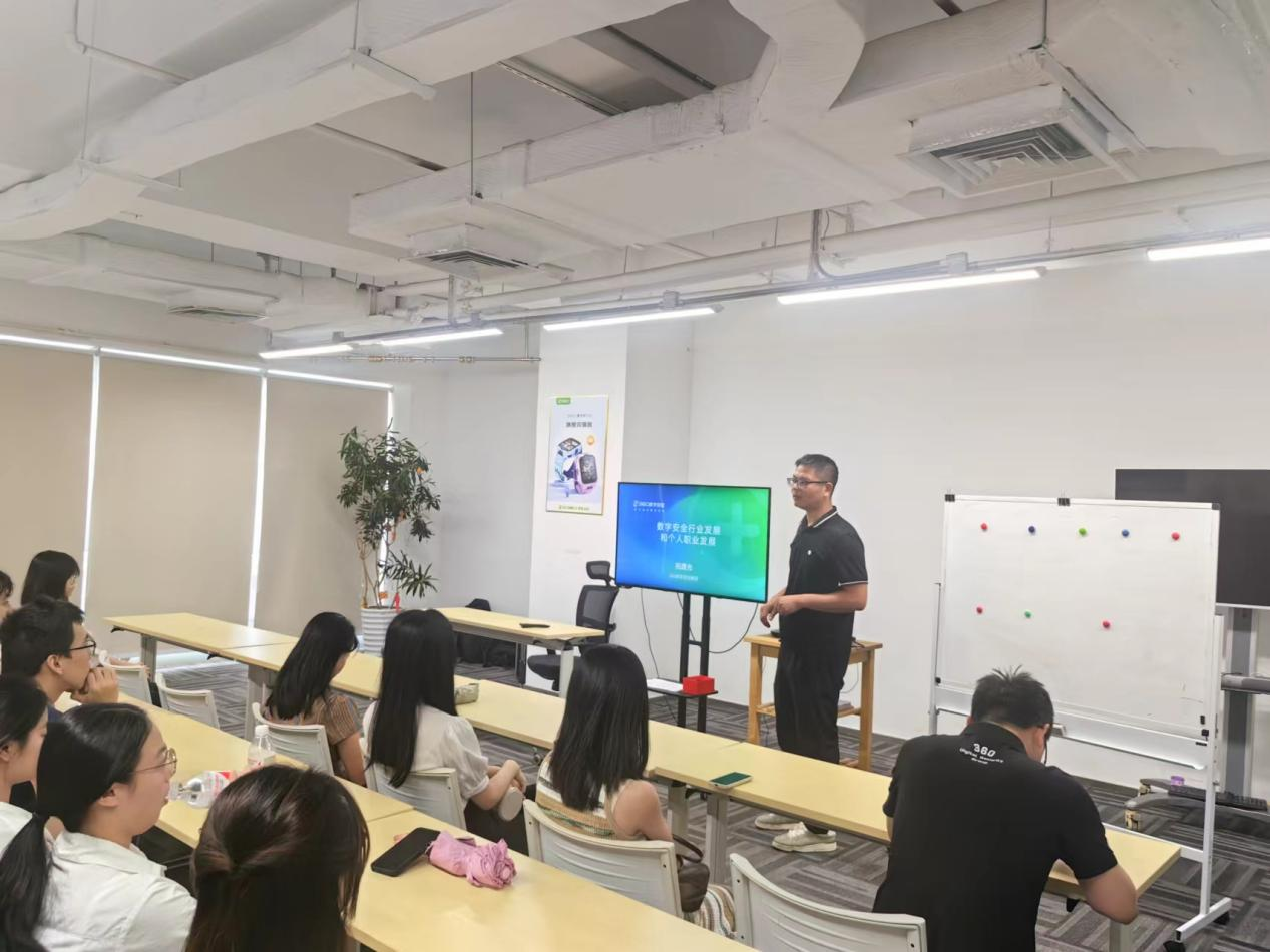 参观结束后,360数字安全集团深圳分公司销售总监许志聪为师生们带来了精彩的360公司介绍及招聘宣讲。他详细介绍了360公司的发展历程、企业文化以及未来的发展前景,让师生们对360公司有了更加全面和深入的了解。同时,他也鼓励同学们积极投身网络安全事业,为国家的网络安全建设贡献自己的力量。