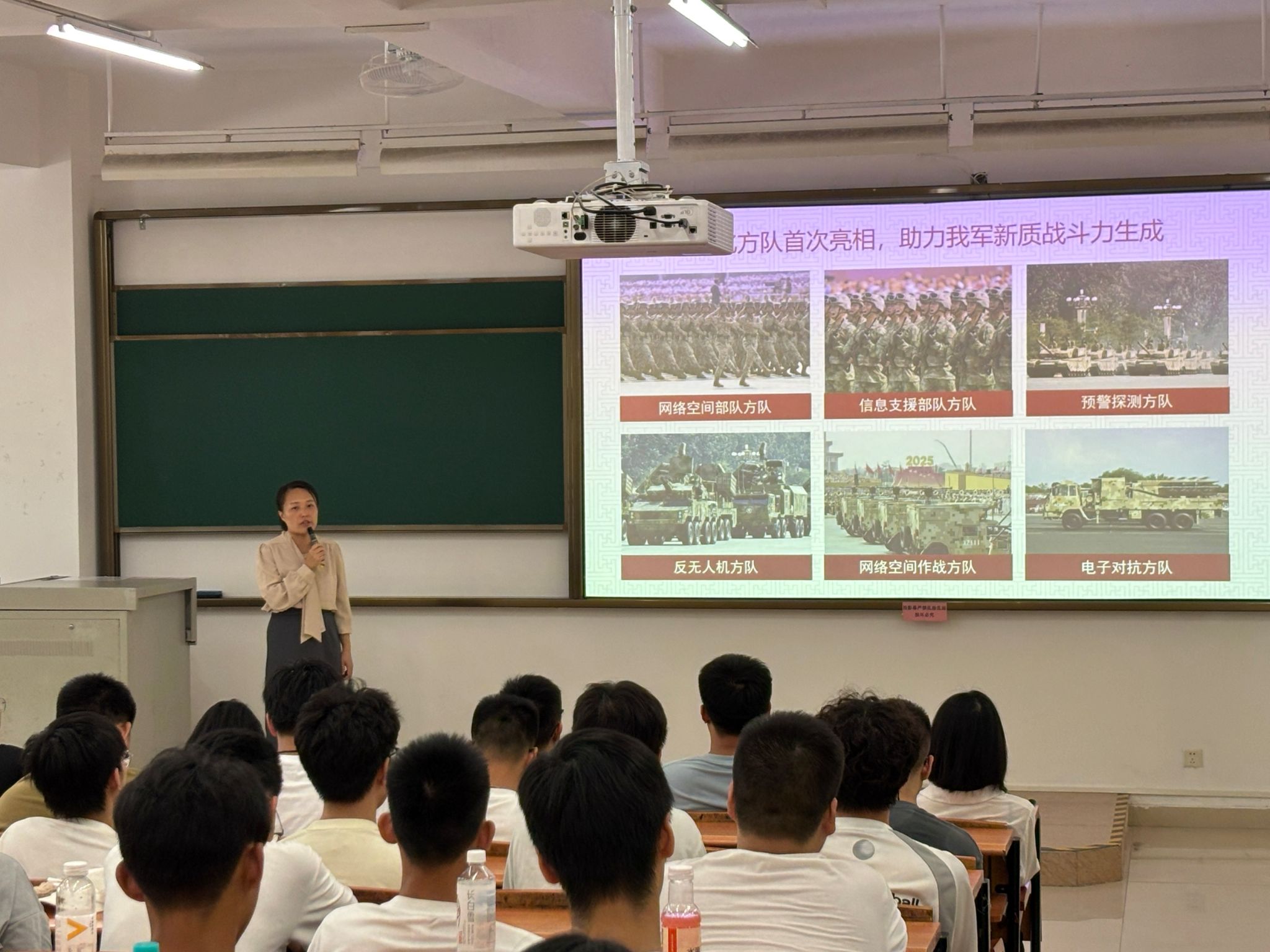 随后,邱书记通过一系列精心挑选的图片和数据,带领同学们回顾新中国成立以来天安门广场上的辉煌阅兵式。从1949年开国大典的首次亮相,到2025年纪念抗战胜利80周年的盛大阅兵,每一次阅兵都是国家实力的展示,每一次亮相都凝聚着民族精神的升华。2025年阅兵式上的多支信息化方队尤为引人注目,网络空间部队、信息支援部队、预警探测方队等新型作战力量的亮相,不仅展示了我国国防科技的飞速发展,更彰显了新时代青年学子肩负的历史使命。